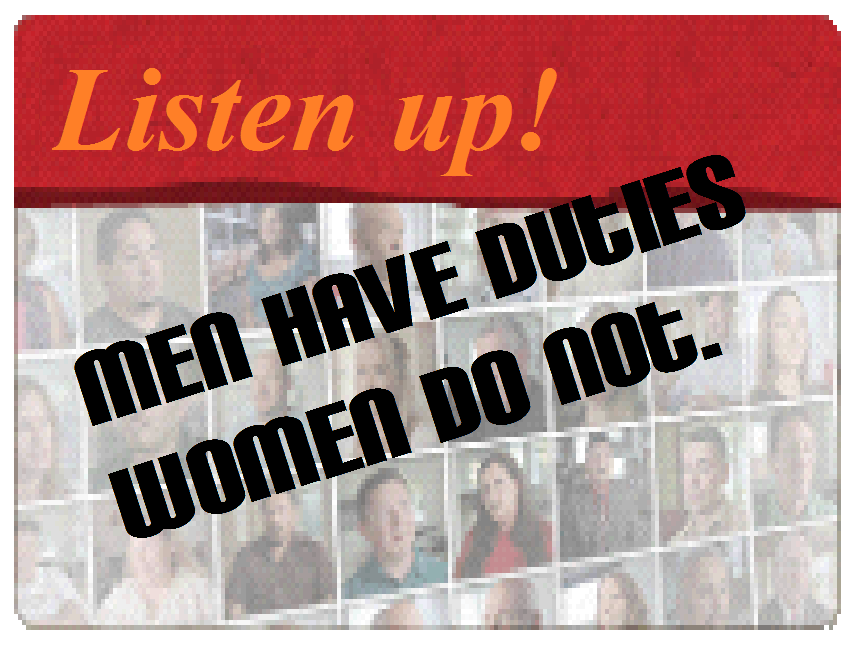 The duties that American men have to American women are many, and consistently enforced by a variety of heavy-handed mechanisms such as mandatory jail-time, court-imposed fines, the yanking of your driver’s license, and separation from your children. As if that wasn’t enough to force you to comply, there is also being disqualified for financial aid in college, community shaming, and denial of sex.